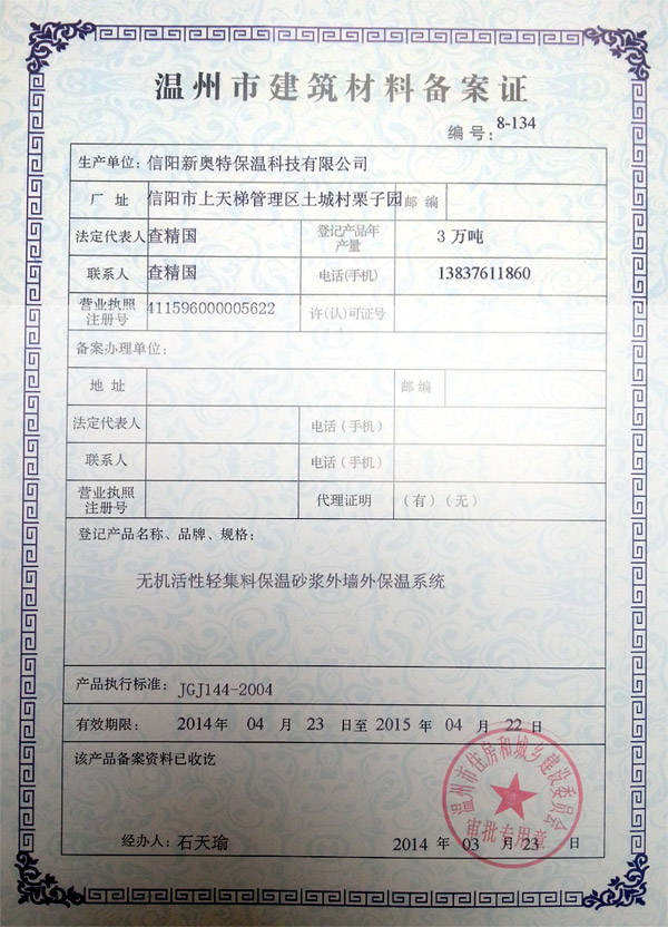 信陽新奧特保溫科技有限公司生產無機活性保溫砂漿在溫州市獲得推廣證書、溫州市推廣中心領導見了本公司產品后不斷地說好。立即組織幾位溫州市建筑專家觀看公司產品和系統檢測報告資料連連說好、使用方便、綠色環保、保溫隔熱效果好、耐久性長、又是A級防火材料、省時省力、完全符合溫州市地方標準。溫州是浙江省東大門、是世界的窗口、中國商品發達城市、一個好的產品、是一個國家發展的象征、外國的好產品我們也有。讓世界了解我們的能力。即將在溫州市大量使用推廣、為溫州市做出外墻保溫好產品好典范。