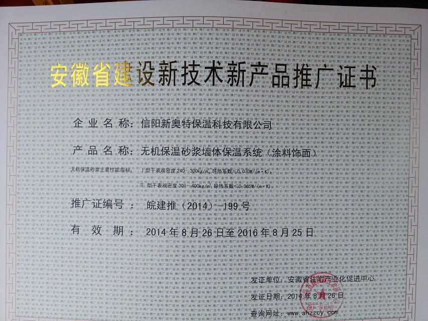 玻化微珠保溫板江蘇省推廣證書!產品質量達到國家先進水平。