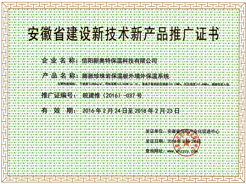 安微省膨脹珍珠巖保溫板推廣證書