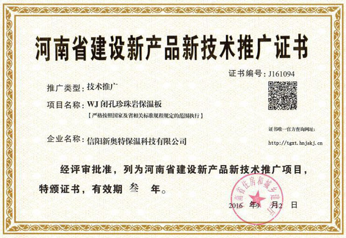 河南省WJ閉孔珍珠巖保溫板推廣證書